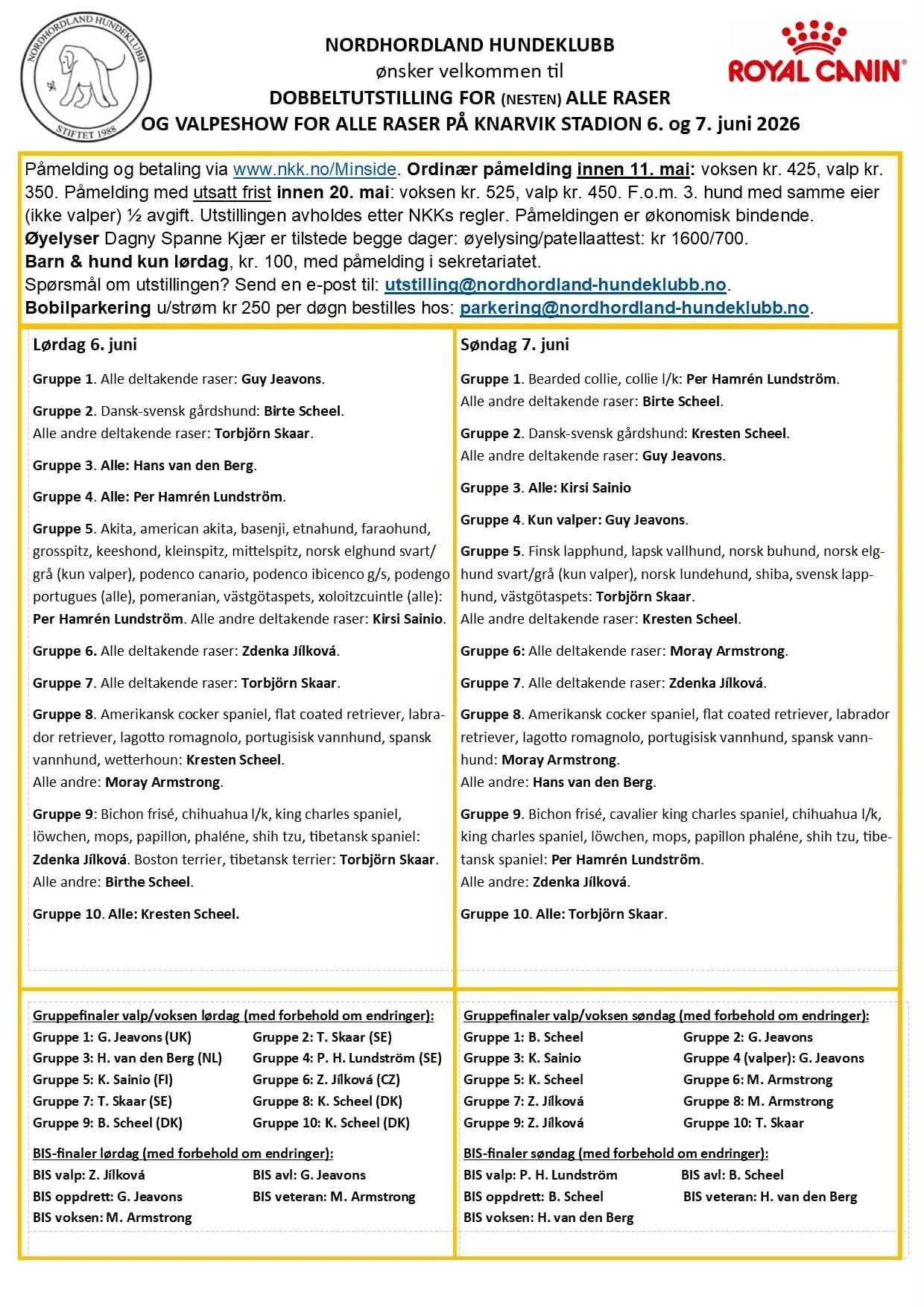 ✚ gCal ✚ iCal NORDHORDLAND HUNDEKLUBB ARRANGERER DOBBELTUTSTILLING I KNARVIK!Påmeldingen til vår flotte dobbeltutstilling er åpnet. Husk å melde på begge dager 😊Velkommen!