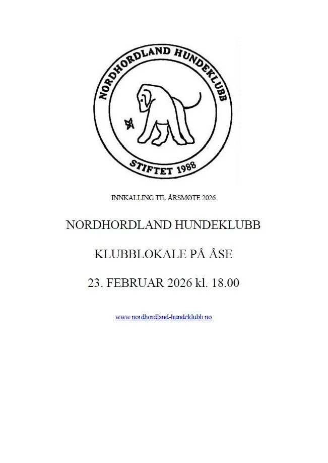 Innkalling til Årsmøte Nordhordland Hundeklubb 23 februar kl.18.00Sted: Klubblokalet på ÅseOm noen ønsker å få tilsendt årsmelding og regnskap , må de sende en epost til Birte. Email INNKALLINGEN FINNER DU HER